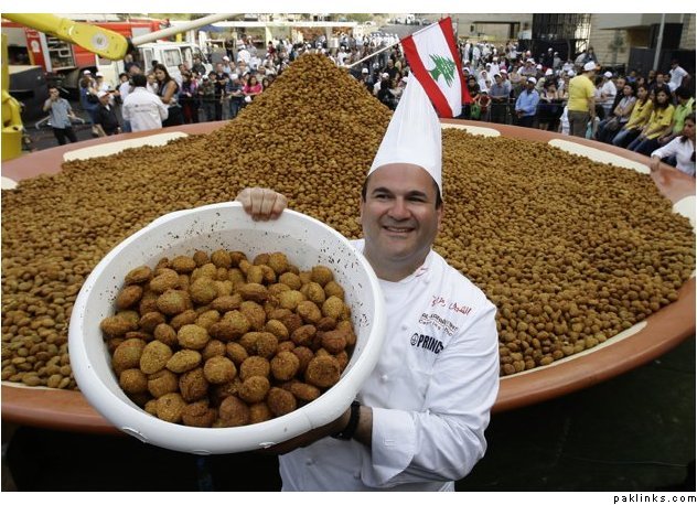 The term moreish may have been coined to describe falafel, which can never be consumed in small quantities. Anyone wishing to put themselves to the test could attempt to eat this portion served up by Lebanese chef Ramzi Choueiry, which weighed in at 11,400 lbs (173 kg).