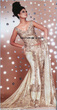 It looks like it has those diamond type stones on it. That is heavily in fashion (or still was a few months back, probably still is now as well). I don't think it's really kundan, but more heavier stone work. Yeah, definitely stone work and some silver beading too. I would say it's a skin colour, maybe chiffon and silk material .... probably a heavier chiffon to hold the stones. It's really sheer which is why I think it's chiffon. It's really pretty.