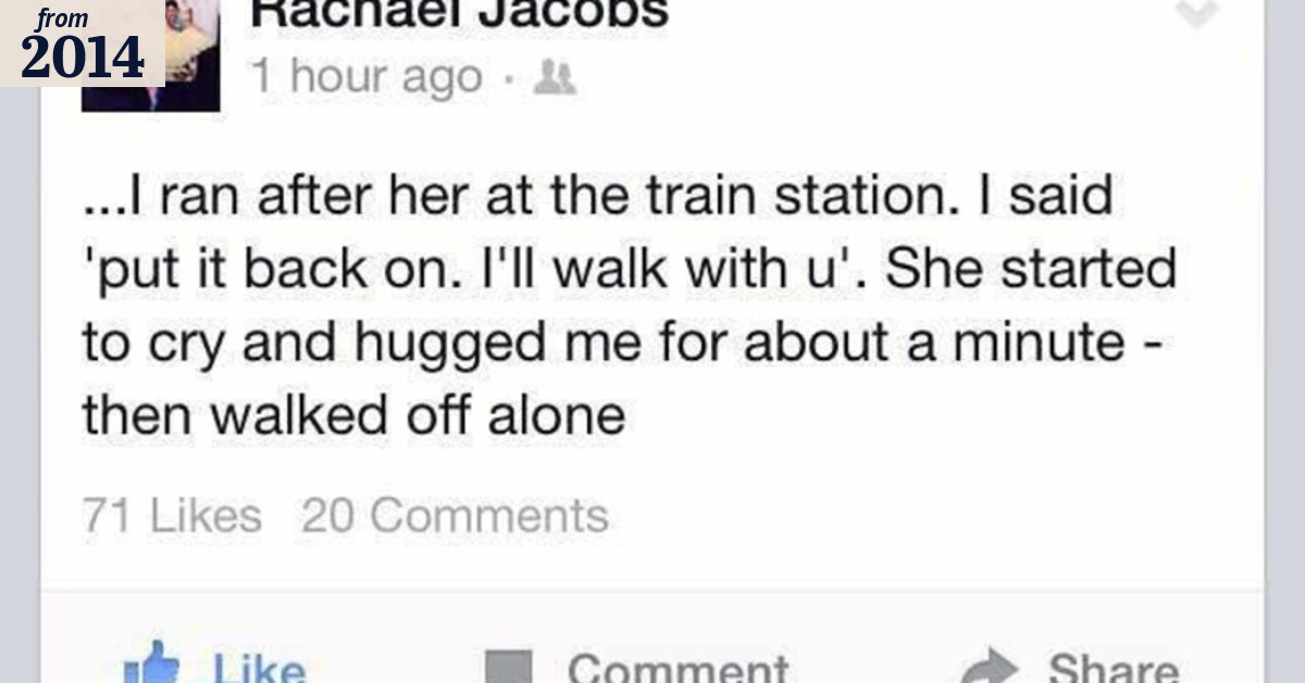 “I ran after her at the train station. I said ‘put it back on. I’ll walk with u’. She started to cry and hugged me for about a minute - then walked off alone.”