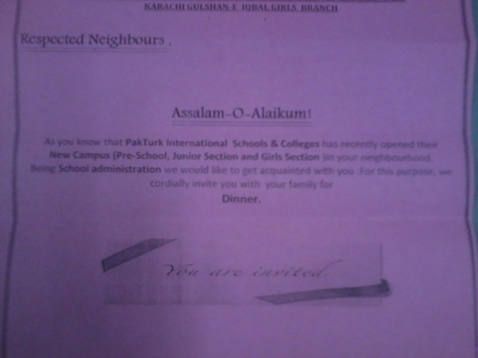 As you know that PakTurk international schools & colleges has recently opened there New Campus(Pre-school,junior section & girls section) in your neighbourhood.Being school administration we would like to get acquainted with you.For this purpose, we cordially invite you with your family for Dinner.