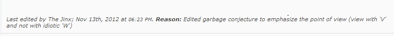 Now to the topic. What I have noticed is that he edits posts of the members who he disagrees with, and often personally goes after people. I think that is not only childish, but I think it violates forum rules and mods code of conduct.