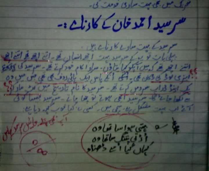 AligaRh meN award winning yeh mazmoon maiN ne hii likhaa thaa…teacher ko mulaazimat se nikaal diyaa gayaa thaa kiuN k merii ooNchii ooNchii baateN uske sar ke oopar se nikal gaii thiiN aur isii liye us ne mujeh 0/8 diyaa thaa…mere iHtijaaj ke ba’d mere number reverse kar diye gaye the aur meraa final mark thaa…8/0 ![]()