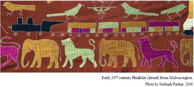 The dating of these embroideries poses a great difficult. It cannot be said with certainty when the first phulkãri was made; indeed no example is known today which can be positively dated to earlier than the 1820s. Even one hundred years old phulkãris are very rare. Though the textiles themselves might not have survived - due to natural wear and tear and the effects of Indian climate, the best among such embroideries available today were probably made between 1870 and 1920. Museums in Ahmedabad, Delhi, Lahore and London include many baghs and phulkãris among their acquisitions.