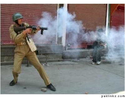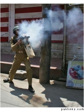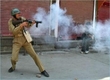 An Indian policeman fires a tear gas towards Kashmiri protesters during a protest in Srinagar June 23, 2008. Indian police in Kashmir’s main city fired tear gas and used batons on Monday to disperse hundreds of Muslim demonstrators protesting against a government decision to transfer forest land to a Hindu shrine trust.