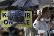 Syed Ali Shah Geelani (R), a senior Kashmiri hardline separatist leader, addresses a protest near a placard which reads “Kashmir on sale” in Srinagar June 23, 2008. Indian police in Kashmir’s main city fired tear gas and used batons on Monday to disperse hundreds of Muslim demonstrators protesting against a government decision to transfer forest land to a Hindu shrine trust. Authorities last week said nearly 100 acres of forest land in Kashmir was being transferred to Shri Amarnathji Shrine Board (SASB) to erect temporary structures for thousands of pilgrims who annually trek to a cave shrine deep in Himalayas.