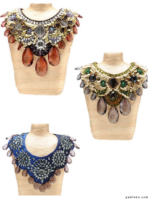 I like them but i feel like desi clothes are often too overpowering to be paired with simple bold designs like these necklaces. Just like how desi jewelry is too overpowering to go w/ western clothes. I guess we just like to explode with patterns and embroidery whenever we deck ourselves out :D