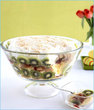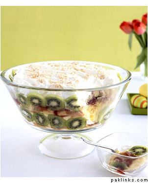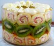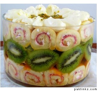 In a deep bowl, place a layer of the cake pieces, top with a layer of banana/grapes/strawberry/pineapple. Then layer with a thin layer of jello and top with pudding. Repeat the layer and end with pudding on the top. Basically now add whip cream and decorate with pretty cut fruit, like kiwi slices, strawberry slices, rasperries...anything.
