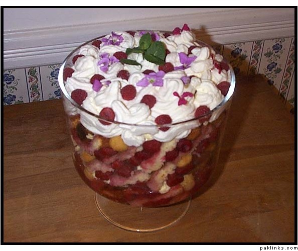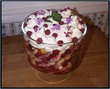 A classic trifle, with raspberries, almond cookies, and lemon whipped cream. Garnished with edible flowers.
