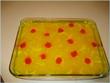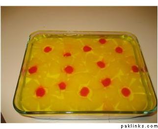 i really meant that ....i cut the pineapple slices into 4 pieces each and set it to look like flower petals with a cherry in the center....and pouring yellow jello (pineapple flavored) over it ...this way u can see the pineapple flowers thru that....