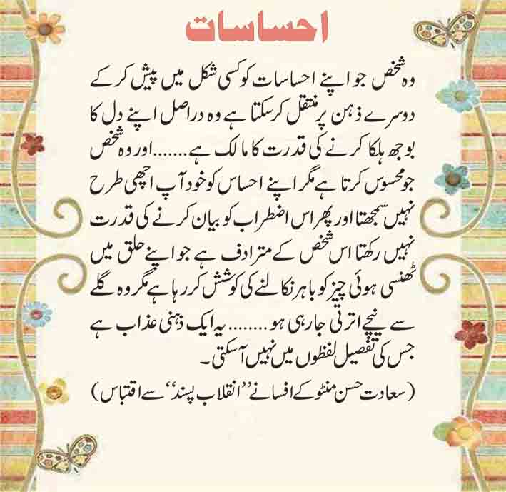 وہ شخص جو اپنے احساسات کو کسی شکل میں پیش کرکے دوسرے ذہن پر منتقل کرسکتا ہے وہ دراصل اپنے دل کا بوجھ ہلکا کرنے کی قدرت کا مالک ہے ۔۔۔۔۔۔۔۔۔۔ اور وہ شخص جو محسوس کرتا ہے مگر اپنے احساس کو خود آپ اچھی طرح نہیں سمجھتا اور پھر اس اضطراب کو بیان کرنے کی قدرت نہیں رکھتا اس شخص کے مترادف ہے جو اپنے حلق میں ٹھنسی ہوئی چیز کو باہر نکالنے کی کوشش کررہا ہے مگر وہ گلے سے نیچے اترتی جارہی ہو ۔۔۔۔۔۔۔۔۔۔ یہ ایک ذہنی عذاب ہے جس کی تفصیل لفظوں میں نہیں آسکتی۔