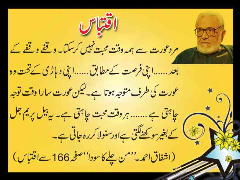 [RIGHT]**مرد عورت سے ہمہ وقت محبت نہیں کرسکتا۔ وقفے وقفے کے بعد ۔۔۔۔۔۔۔ اپنی فرصت کے مطابق ۔۔۔۔۔۔ اپنی دہاڑی کے تحت وہ عورت کی طرف متوجہ ہوتا ہے۔ لیکن عورت سارا وقت توجہ چاہتی ہے ۔۔۔۔۔۔ ہر وقت محبت چاہتی ہے۔ یہ بیل پریم جل کے بغیر سوکھنے لگتی ہے اور سنولا کر رہ جاتی ہے۔