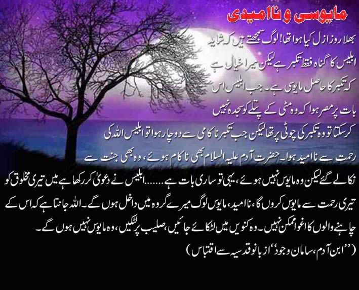 بھلا روز ازل کیا ہوا تھا، لوگ سمجھتے ہیں کہ شاید ابلیس کا گناہ فقط تکبر ہے لیکن میرا خیال ہے کہ تکبر کا حاصل مایوسی ہے۔ جب ابلیس اس بات پر مصر ہوا کہ وہ مٹی کے پتلے کو سجدہ نہیں کرسکتا تو وہ تکبر کی چوٹی پر تھا لیکن جب تکبر ناکامی سے دوچار ہوا تو ابلیس اللہ کی رحمت سے ناامید ہوا۔ حضرت آدم علیہ السلام بھی ناکام ہوئے، وہ بھی جنت سے نکالے گئے لیکن وہ مایوس نہیں ہوئے، یہی تو ساری بات ہے ۔۔۔۔۔۔۔۔۔۔۔ ابلیس نے دعویٰ کررکھا ہے میں تیری مخلوق کو تیری رحمت سے مایوس کروں گا، ناامید، مایوس لوگ میرے گروہ میں داخل ہوں گے۔ اللہ جانتا ہے کہ اس کے چاہنے والوں کا اغوا ممکن نہیں۔ وہ کنویں میں لٹکائے جائیں، صلیب پر لٹکیں، وہ مایوس نہیں ہوں گے۔