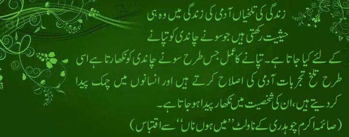 [RIGHT]زندگی کی تلخیاں آدمی کی زندگی میں وہ ہی حیثیت رکھتی ہیں جو سونے چاندی کو تپانے کے لئے کیا جاتا ہے۔ تپانے کا عمل جس طرح سونے چاندی کو نکھارتا ہے اسی طرح تلخ تجربات آدمی کی اصلاح کرتے ہیں اور انسانوں میں چمک پیدا کردیتے ہیں، ان کی شخصیت میں نکھار پیدا ہوجاتا ہے۔[/RIGHT]