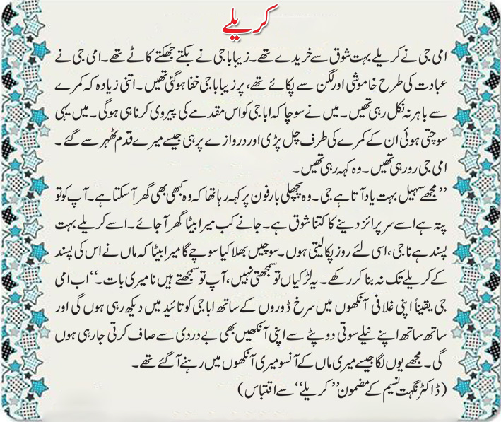 (ڈٓکٹر نگہت نسیم کے مضمون ’’کریلے‘‘ سے اقتباس)
