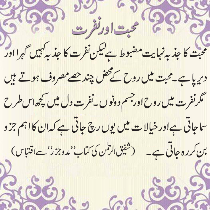 محبت کا جذبہ نہایت مضبوط ہے لیکن نفرت کا جذبہ کہیں گہرا اور دیرپا ہے۔ محبت میں روح کے محض چند حصے مصروف ہوتے ہیں مگر نفرت میں روح اور جسم دونوں۔ نفرت دل میں کچھ اس طرح سما جاتی ہے اور خیالات میں یوں رچ جاتی ہے کہ ان کا اہم جزو بن کر رہ جاتی ہے۔