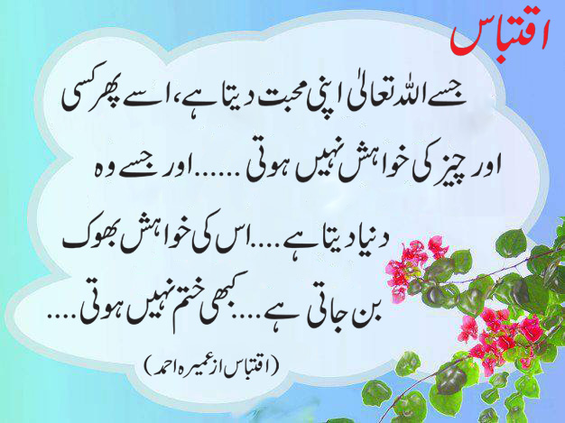 جسے اللہ تعالیٰ اپنی محبت دیتا ہے، اسے پھر کسی اور چیز کی خواہش نہیں ہوتی ۔۔۔۔۔۔۔۔ اور جسے وہ دنیا دیتا ہے ۔۔۔۔۔۔۔ اس کی خواہش بھوک بن جاتی ہے ۔۔۔۔۔۔ کبھی ختم نہیں ہوتی ۔۔۔۔۔۔۔