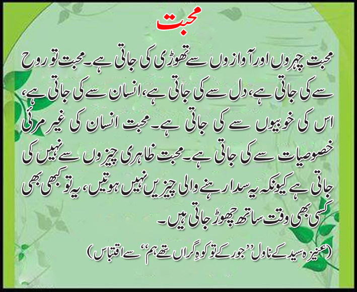 محبت چہروں اور آوازوں سے تھوڑی کی جاتی ہے۔ محبت تو روح سے کی جاتی ہے، دل سے کی جاتی ہے، انسان سے کی جاتی ہے، اس کی خوبیوں سے کی جاتی ہے۔ محبت انسان کی غیر مرئی خصوصیات سے کی جاتی ہے۔ محبت ظاہری چیزوں سے نہیں کی جاتی ہے کیونکہ یہ سدا رہنے والی چیزیں نہیں ہوتیں، یہ تو کبھی بھی کسی بھی وقت ساتھ چھوڑ جاتی ہیں۔