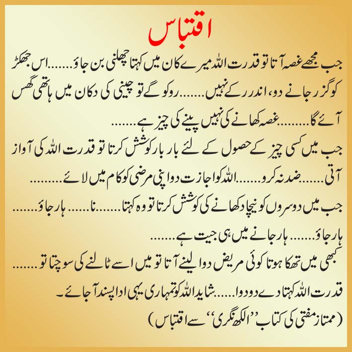 **مجھے جب غصہ آتا تو قدرت اللہ میرے کان میں کہتا چھلنی بن جاؤ ۔۔۔۔۔۔۔ اس جھکڑ کو گزر جانے دو، اندر رکے نہیں ۔۔۔۔۔۔۔۔۔ روکوگے تو چینی کی دکان میں ہاتھی گھس آئے گا ۔۔۔۔۔۔۔۔۔ غصہ کھانے کی نہیں پینے کی چیز ہے ۔۔۔۔۔۔۔۔۔