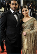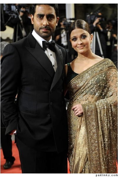 It looks like the bottom of the sari (part thats wrapped around her legs) is in silk jamawaar, and the upper part (wrapped around her upper body) is probably net or chiffon. My guess would be net though, from the looks of it.