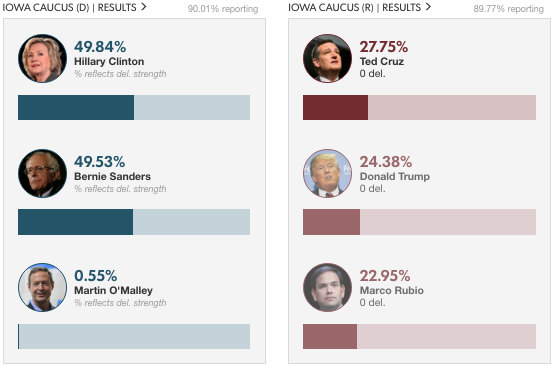 Here we go.. the day has come when US Presidential elections process formally start. As the first step which is called Primary to get one final candidate from the party, polling for Iowa Caucas has begun. Mr. Trump is leading the GOP with majority while Clinton and Bernie Sanders are in tight race from democrats side.