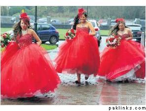 Just three of the eight bridesmaids - Rebecca Quilligan, Sabrina O’Brien and Melanie Kelly - running for cover from the rain at the wedding: