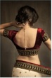 A maroon velvet saree blouse with a black border embellished with Zardosi work.
