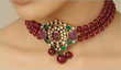 i'd do one color- the necklace has pearls in it too and all that kundan- i think its a cleaner finish with just the rubies or just the emeralds.