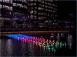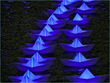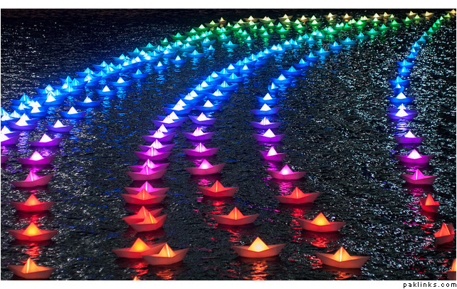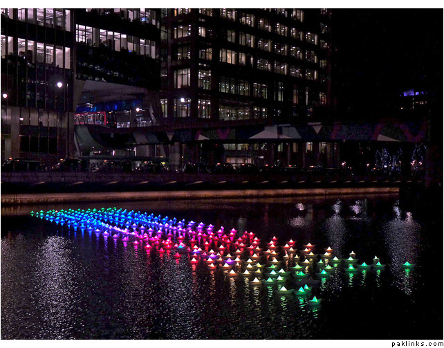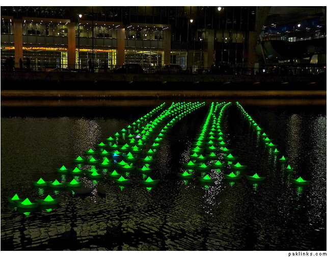 An installation created by arhitect Claudio Benghi and light artist Gloria Ronchi. Situated in London’s Canary Wharf, this beautiful fleet of 300 illuminated boats is called Voyage. Each floating light is reminiscent of a paper-folded origami boat that is illuminated from within, and a wireless network in the vicinity allows people to alter the colour of the entire installation.
