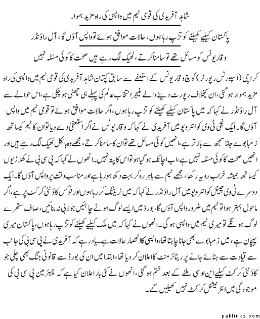 **Is that a hint that Afridi is coming back soon? But did n't Afridi say that he won't come back unless Ijaz Butt steps down? Also Shoaib Malik comes back and the coach resigns. Coincidence?