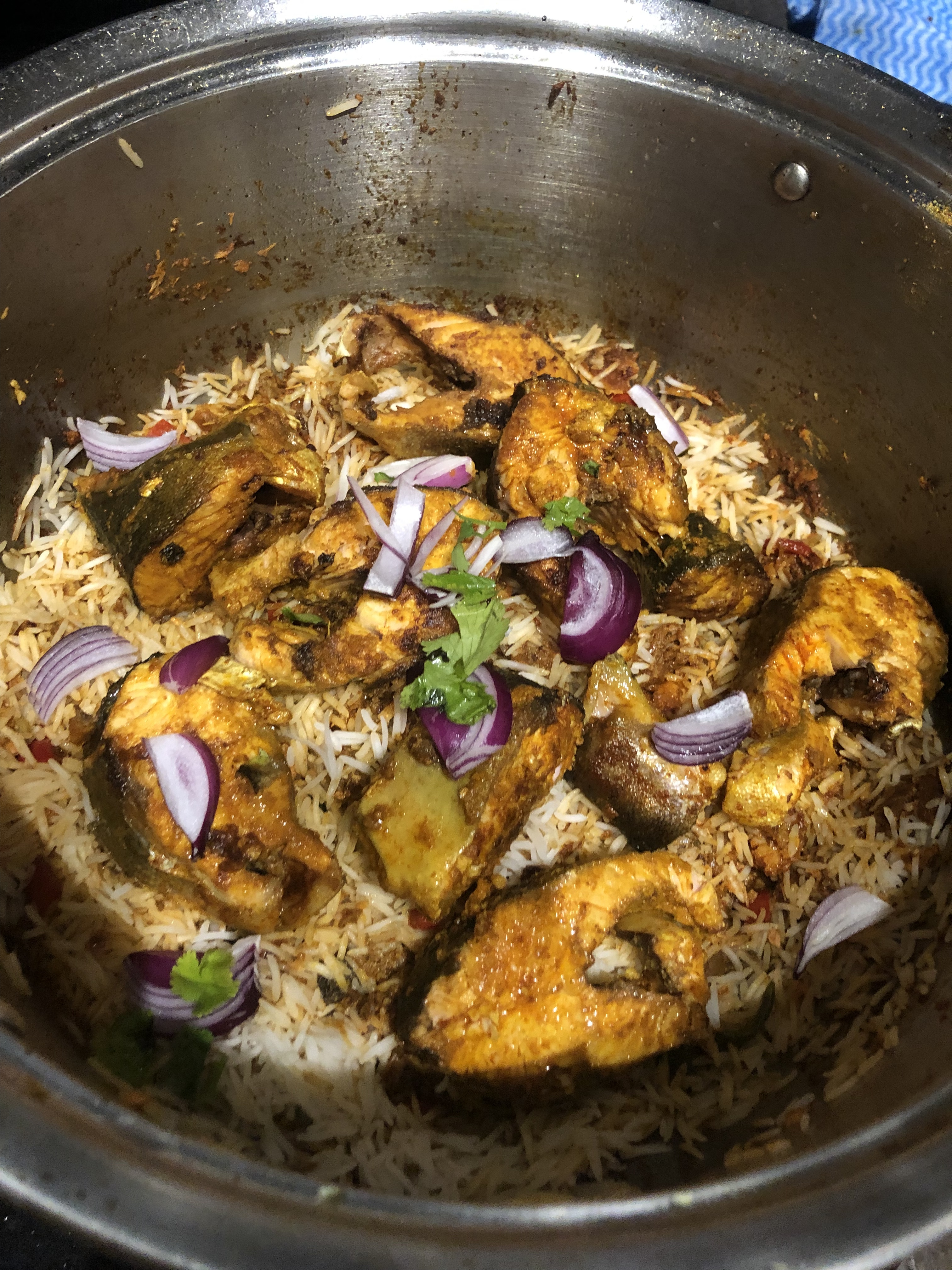 Making seafood biryani with oysters clams salmon shrimps and peppers