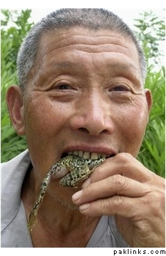 Jiang Musheng, a 66-year-old resident, eats a live tree frog at a village in Shangrao, in eastern China’s Jiangxi province in this May 21, 2007 picture. Jiang suffered from frequent abdominal pains and coughing 20 years ago, until an old man called Yang Dingcai suggested tree frogs as a remedy, the Beijing News said on Tuesday. Picture taken May 21, 2007. (China Daily/Reuters)