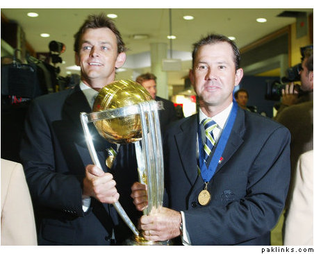 Captain Ricky Ponting and vice-captain Adam Gilchrist strode into the arrivals hall clutching the World Cup trophy.