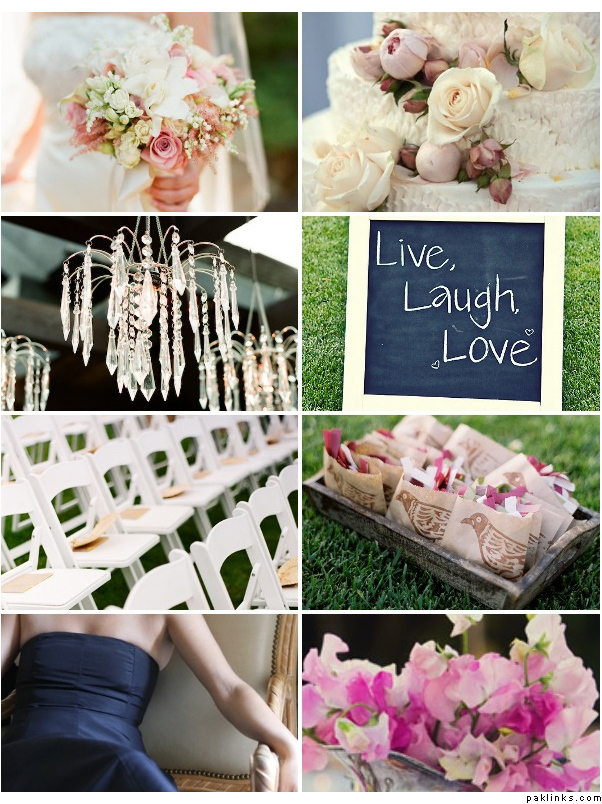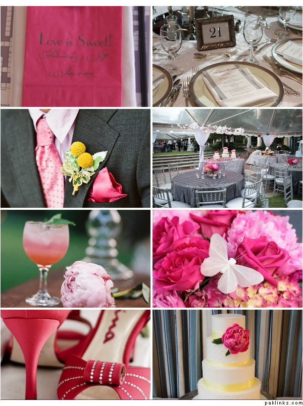 so she’s wearing pink and lavendar and he’s doing slate grey and pink… hrm… i’d pick up on his grey and maybe do a lighter, dove grey, silver accents, lots of crystal, and a mix of ivory and pink flowers. see a good florist and try out ivory with pale pink, all pale pink, or pale pink and hot pink flowers.