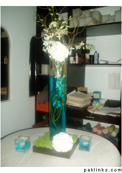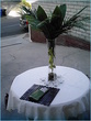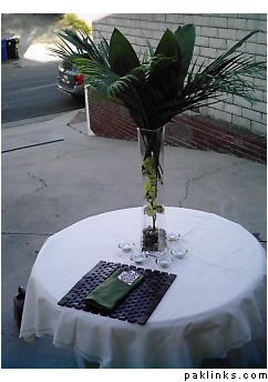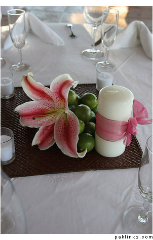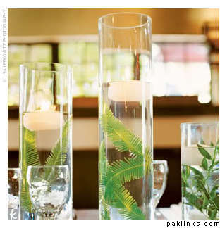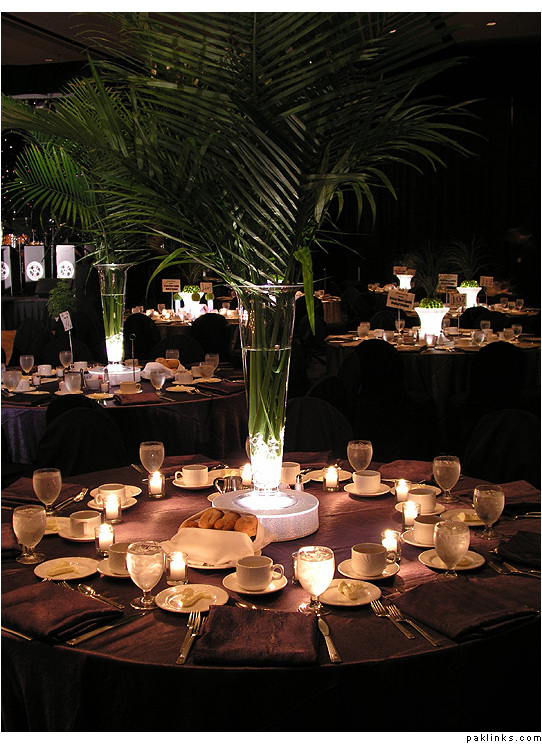 You can alternate these Palm centerpieceswith smaller centerpieces and surrounding them with bright pink flower petals will add some color.