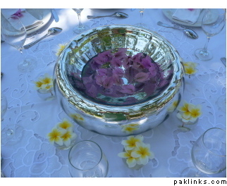 Plumeria and silver bowl centerpiece: