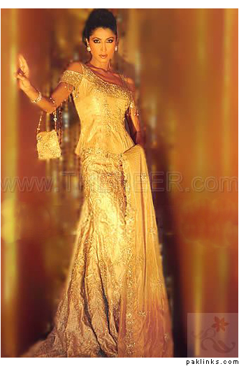 i quite liek the idea of gold/offwhite dres with red emrboidery motif towards bottom and the netted (see through) duppata with red stones and white stones on the border, the top will be corset style with a nice frame around the neckline and the bottom of the blouse!