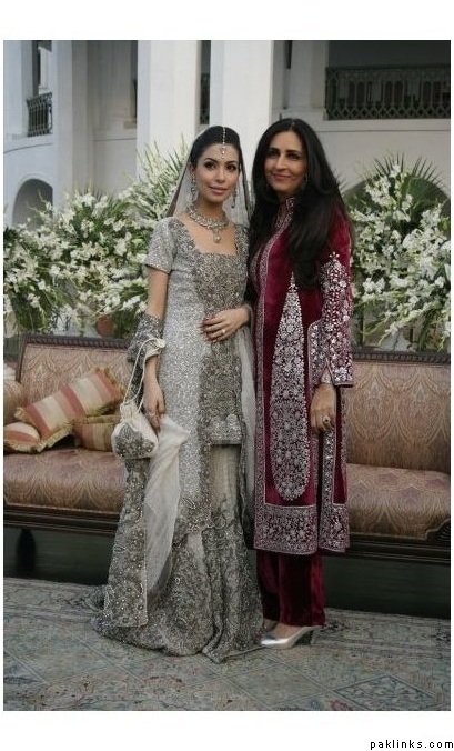 I have always regarded Pakistani brides with ghararas, longer kameez,(up to the knees) flared shararas with trains etc while Hindustani(muslim) brides usually wear shorter shirts(up to the hips) with mermaid cut lenghas, no matter the era. Thats just my observation.