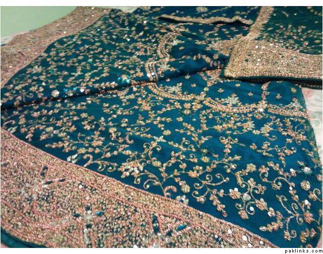 I’m selling my Nikkah outfit that I barely wore for 4 hours. Its in excellent condition and very beautiful. It has 5 inch heavy zardosi borders all around the lengha and on one side of the dupatta. The lengha is extremely heavy with kaam! The lengha is an umbrella style- lots of fabric, almost 140 or more all around! It is in a nice blue shade, in person its a darker shade but in pictures with flash the colour comes out lighter. Nonetheless, its a beautiful colour. The kaam is gold in colour with a hint of pink. The choli comes with 3/4 sleeves. I’m selling the outfit for $600 USD, pm if anyone is interested or for more details.