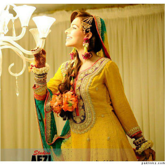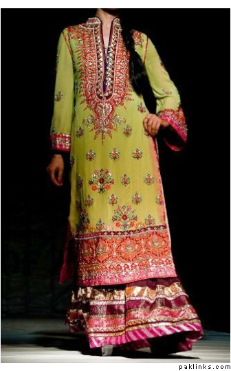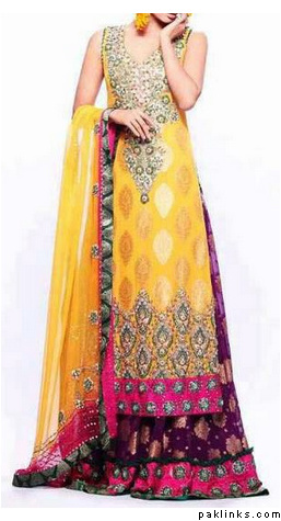 I have googled alot ( and that literally means glued to the laptop whenever i can ) but i am not able to find wht i want. i dont mind any other colors but i want yellow to be included. i was considering the sara’s karma outfit, a few other picks too ali zeeshan’s dull yellow kameez, nomi’s tangerine angrakha too..but ahh..confused i dun get the two legged jamavar sharara/gharara.