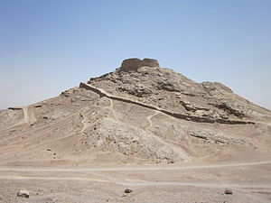 Zoroastrian tradition says that a dead body is unclean, and that the evil corpse demon would rush to a dead body to contaminate it and anything else it came in to contact with. For this reason, the Zoroastrians built towers with a roof containing three concentric rings (one for men, one for women, and one for children) on which they would place the dead bodies until they were completely destroyed by birds and sun. The remaining bones would then be shoved into a central well where they would remain buried inside the tower. This tradition continues to this day in Parsi communities in India. Pictured above are the remains of a tower of silence in Iran.