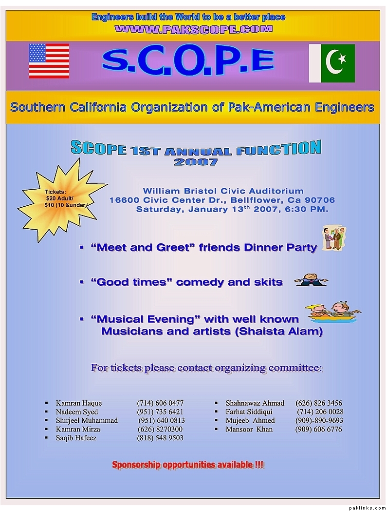 SCOPE IS A NON-PROFIT ORGANIZATION WITH THE BULK OF MEMBERS FROM NED KARACHI. ALSO IT’S MEMBERSHIP CONSIST OF ALL THE ENGINEERS IN SO. CAL. OF PAKI DESCENT. IT’S MAIN OBJECTIVE IS TO PROMOTE THE NETWORKING BETWEEN ENGINEERS, FACILITATE ACADEMIC COUNCIL FOR PROSPECTING, NEW AND EXISTING ENGINEERING STUDENTS, ORGANIZE SOCIAL AND ACADEMIC EVENTS and so on. Please go to www.pakscope.com for further history and more details.