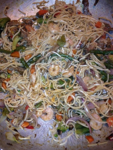 Kids wanted some Chinese so I cooked beef n shrimp chow mein with loads of veggies and fried rice for them an a luscious chicken curry for my wife and her sister and the team coach.