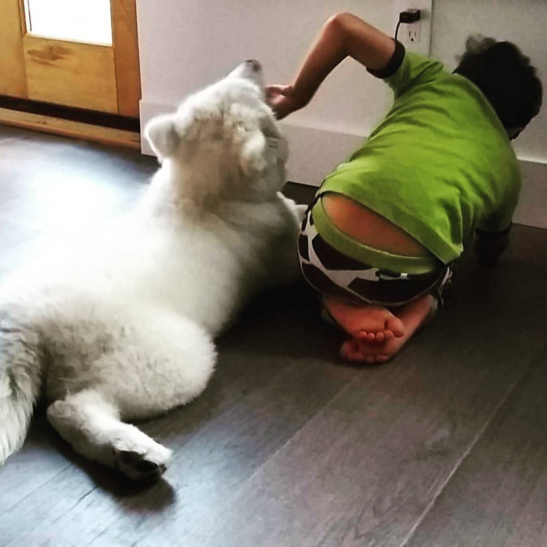 This is my favourite shot of them (when Charles was lots smaller!!) He’s reading his kindle (while being teethered to the outlet) and scratching the dog at the same time. Cracks me up: