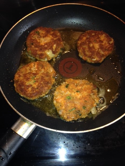 You can do it so many ways, you can use mixture of daal and mashed potatoes for binder, this time I was in a real rush for work so I used the Panko bread crumbs, you should always carry that, it is so amazing. I like mine real spicy so I put lots of chili powder, lemon and cumin powder and chopped cilantro and lemon juice and salt and an egg in the mixture, if the mixture is too mushy add more breadcrums, I didnt brush with egg but some people do. Shallow fry it and don’t be in a hurry to flip or they will break. I used canned salmon, Sockeye is expensive I like Coho also or wild pacific salmon works too. Oh you can add green onions also. I did add some chopped onions too. If you brush with oil and egg then you can bake it also. Tomorrow I might grill some tandoori Salmon. You can also buy frozen Salmon burgers for more western style burgers but I didn’t care for them.