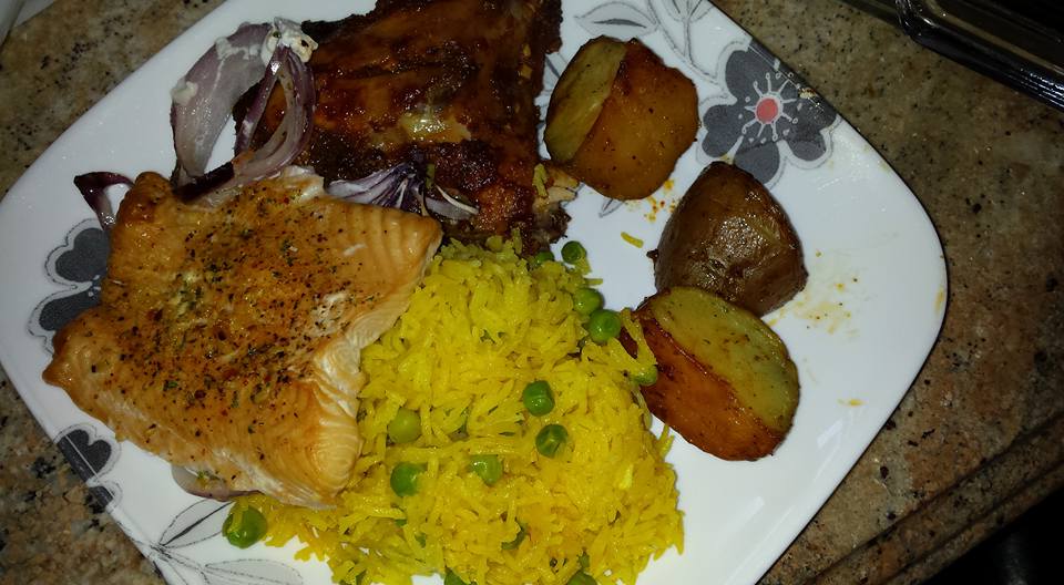 All the black, brown, gora bacchas love the orange rice as they call it, we used to call it taheri, saute diced onions, add some cumin seeds, I love cloves, so a few of those, some ginger garlic paste, generous amount of turmeric and chili powder in a paste, saute the spices, add some yogurt and saute and add washed rice, move them around to coat with oiliness than add two times the water as rice. In its original form you add sliced potatoes with rice also but I like to add peas for adding nutrition. I let the rice sit for 15 minutes before opening the lid.