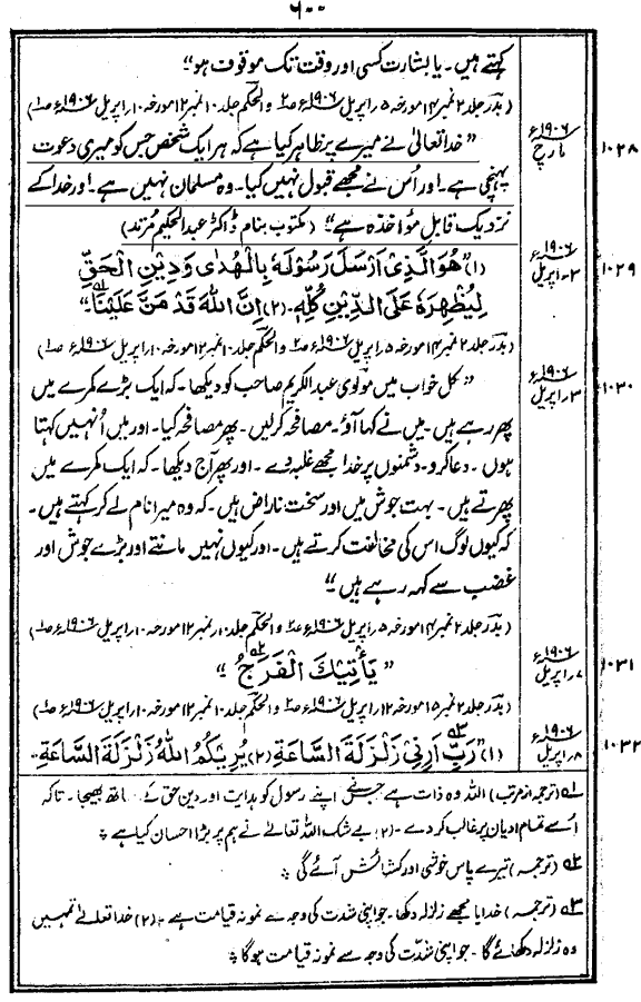 "Regarding the main subject of my article, I wrote that as we believed the Promised Messiah to be one of the prophets of God, we could not possibly regard his deniers as Muslims." A’inah-i Sadaqat (pp. 137-138)