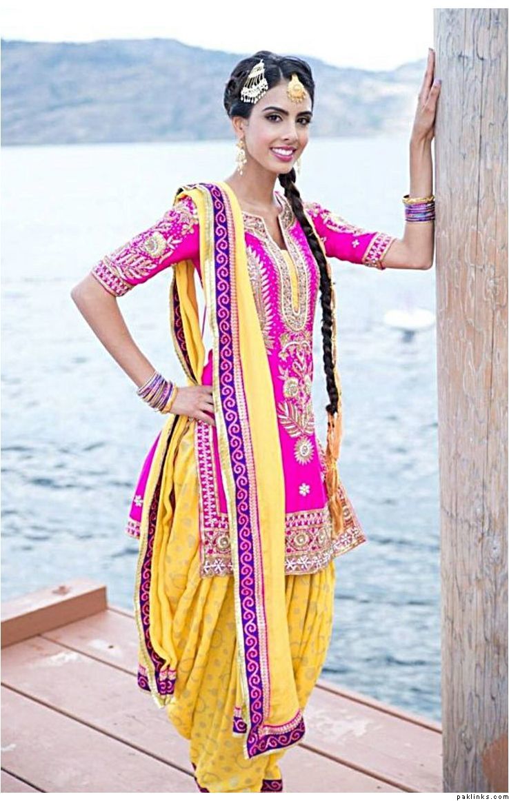 Traditional Punjabi dressing is all about bright, bold and block colours. We typically love yellows, orange and dark green for mehndi. Magenta or hot pink is also considered a very popular choice, it’s second to bridal red, really.
