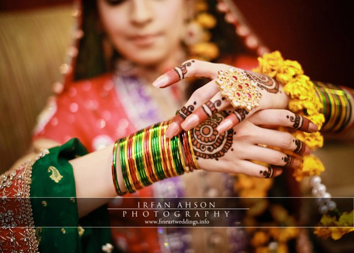 The paranda is a good idea, braids are pretty common, and bright colourful clothing for the Mehndi.