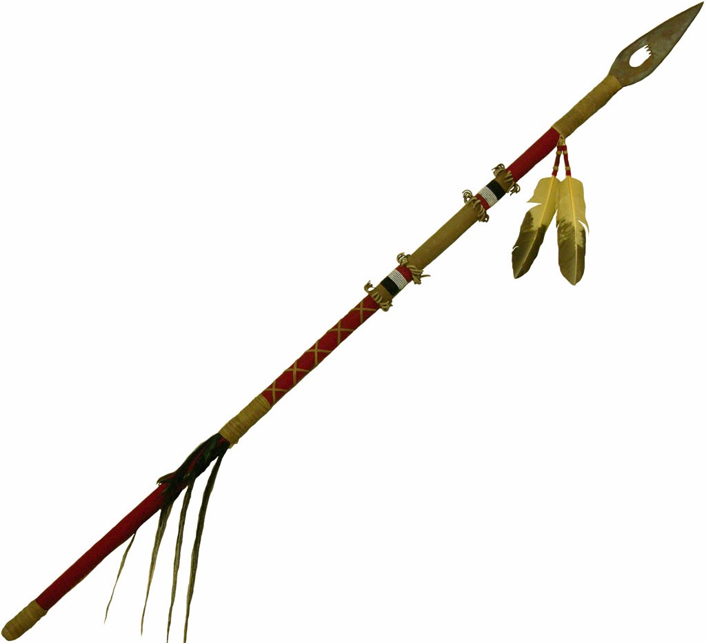 long staff [5-6 feet] with a elongated blunt [not sharp], pointed and flat steel arrow like thing at one end. it’s thrown at a target through the air. it’s also used in hand to hand combat.