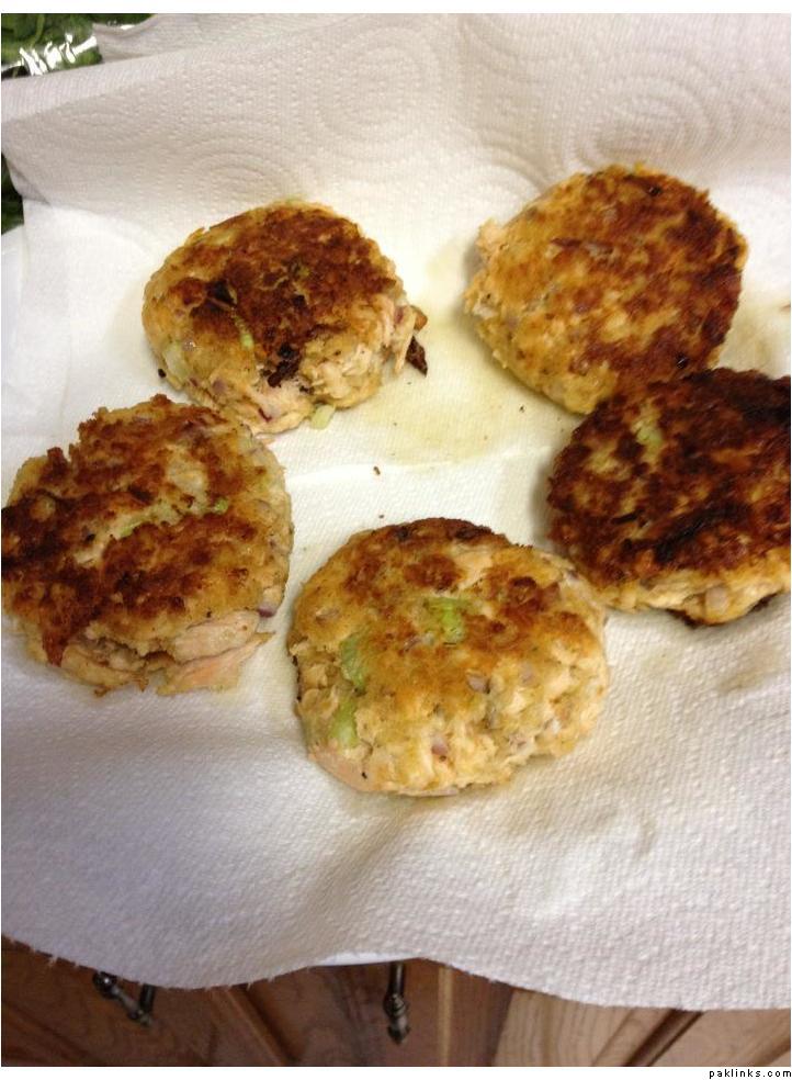 very easy!!! for the original salmon fillet (pic i posted day before)…lay your salmon fillet skin side down on a foil lined baking dish…spread a layer of dijon mustard over the flesh, then sprinkle with salt & fresh ground black pepper…for the topping, if you have italian seasoned breadcrumbs, just combine that with melted butter and sprinkle over…i only had plain Panko breadcrumbs, so i combined that with a packet of italian seasoning and then proceeded…bake at 400 until fish flakes easily…then, to use the leftovers the next day, take whatever salmon you have left and shred with a fork…add one egg, some more breadcurmbs, finely chopped celery & red onion and some grated parm cheese..mix well…if it seems too wet, add a little more breadcrumbs…form into patties… in a non stick pan, heat 1 pat of butter with a little olive oil…cook until patties are crisp and brown on the outside and warm through the middle…i served them with tartar sauce, and steamed veggies!